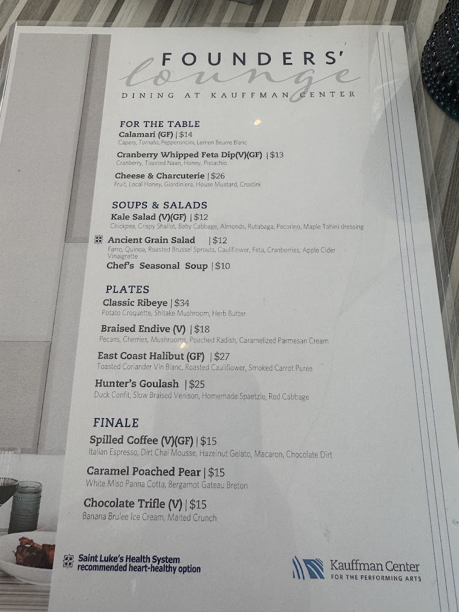 Welcome to the Founders' Lounge, Dining at Kauffman Center, a gem nestled in the heart of Kansas City. Offering an exquisite American menu, this dining experience is perfect for a pre-show meal or a special night out. The culinary highlights include the succulent Classic Ribeye and the delicate East Coast Halibut, each crafted with attention to detail. Guests rave about the innovative soups and salads, like the refreshing Kale Salad and Chef's Seasonal Soup, setting a delightful tone before the main course.